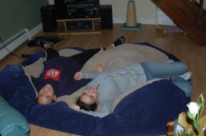 Here’s Laurie and Amanda hamming it up for the camera while deflating the air mattress…oh I mean they were collapsing in exhaustion from the trials of taking care of a newborn. 🙂