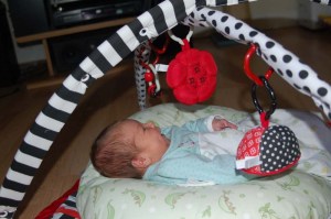 Claire’s little “gym!” I don’t know how much of a workout a baby really requires but here’s Claire hanging out in her gym. She seems rather hypnotized by the colors! Her arms and legs were moving like crazy, it looked like she was trying to swat at the hanging toys.