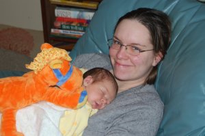 Gina tries to absorb some of the baby’s heat after taking a shower…perhaps a hair dryer would do the trick, right Nanny? 🙂 Check out Claire’s new stuffed pony – thanks Joan!