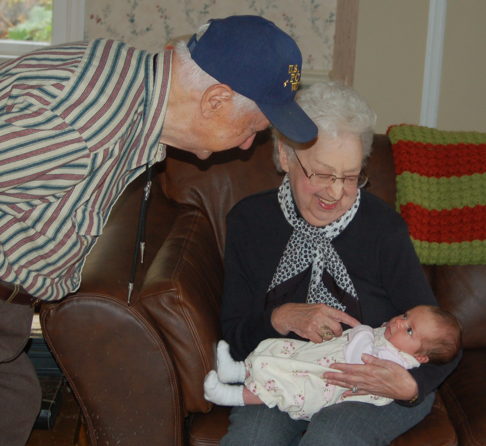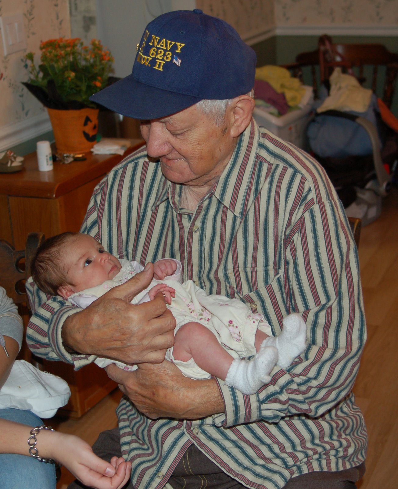 This man did not hold his own daughter until she was able to walk and his granddaughters until they were about 9 months old. It took some cajoling to get him to hold his wobbly-headed great-grandbaby but it was worth the effort. She LOVED his hat and quieted whenever he came by to peek at her.