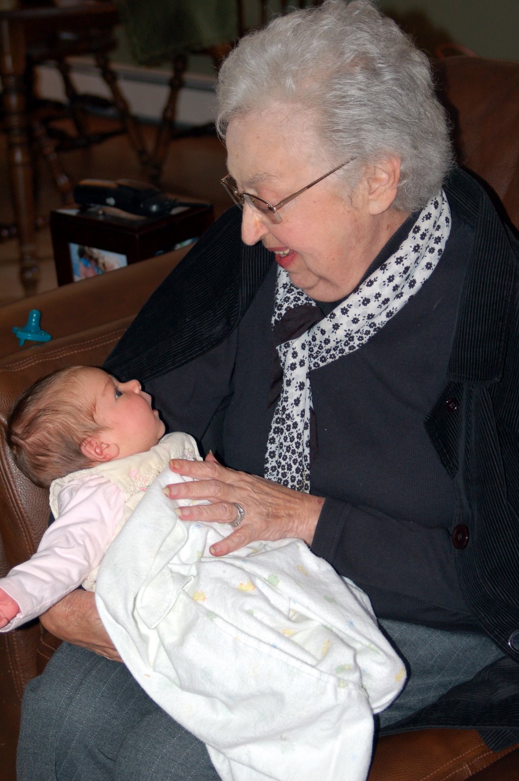 The great-grandparents were in town to meet baby Claire. In addition to posting how sweet they thought she was (very) and how much they enjoyed their time with her (“she’s so precious!”) I thought it would be fun to post some of the rather interesting songs Nan sang to her.