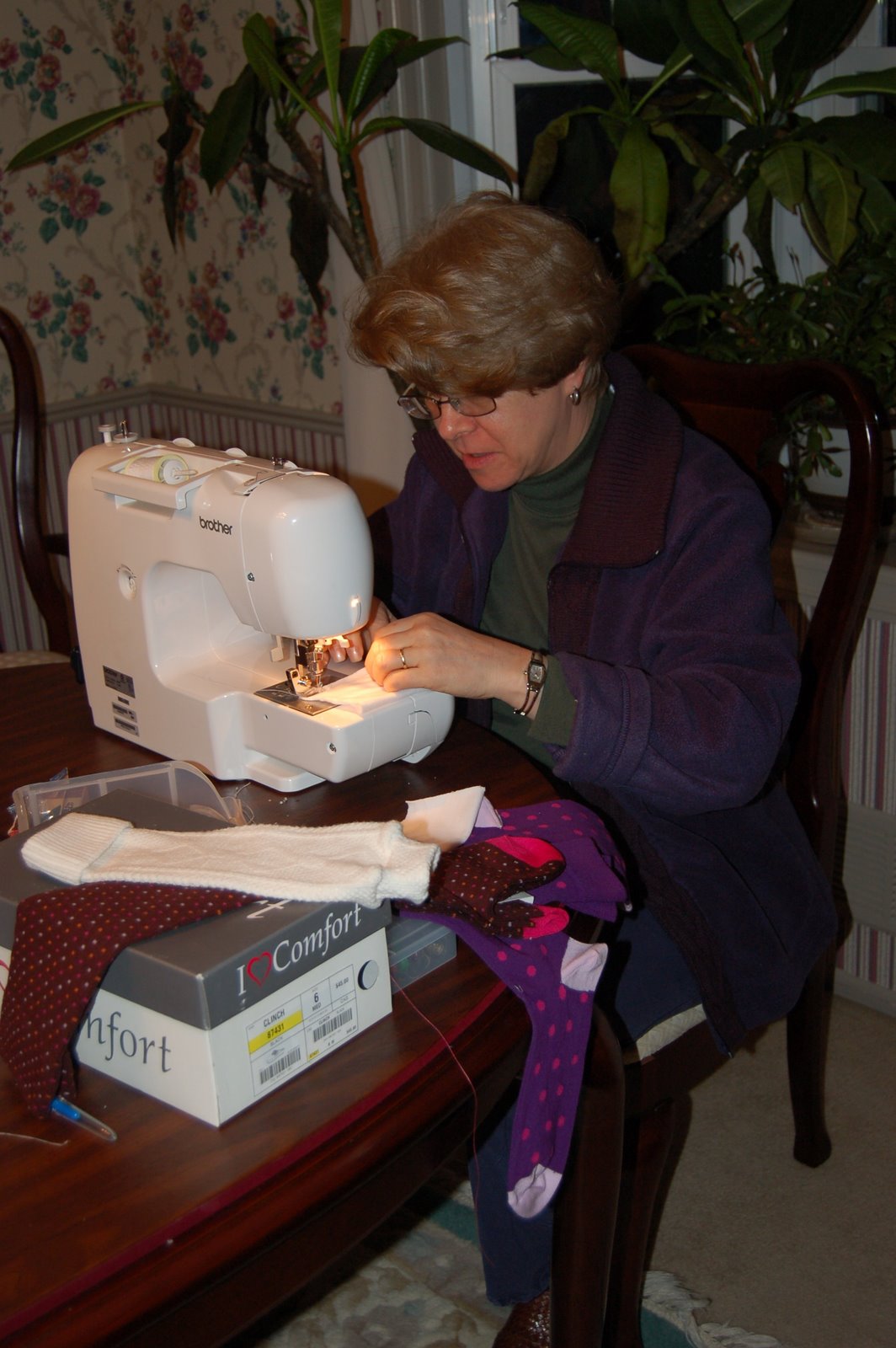 I saw these things called babylegs on the internet and thought they would be a cute alternative to tights for the winter. G-Mom Cherill whipped out the sewing machine and we made a few pairs of our own after finding a tutorial online.