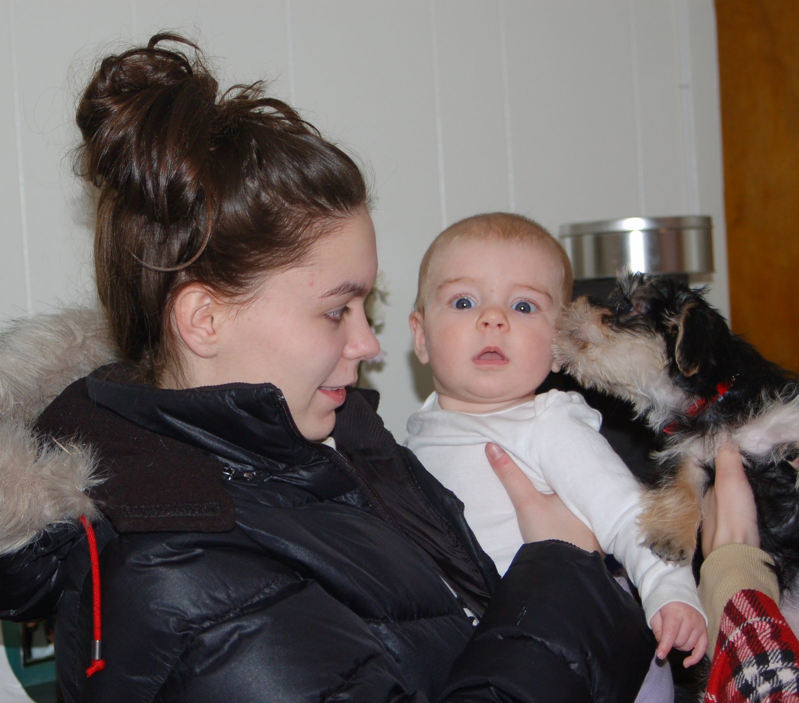 In other news, Claire has a new fur cousin named “Dulche.” Amanda’s little pooch delighted Claire as you can clearly see in the following picture. Heehee, it was early so I was only allotted one shot, but the night before Claire giggled at the puppy. It was rather momentous – her first chuckle at visual, usually we have to tickle her.