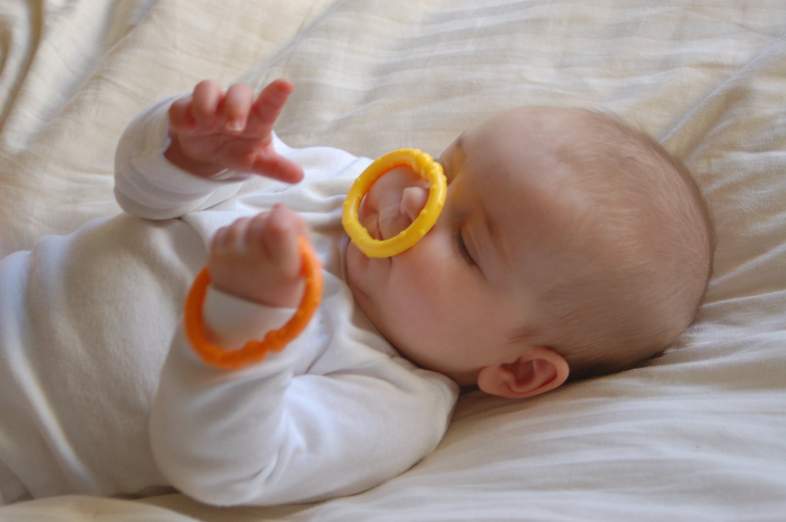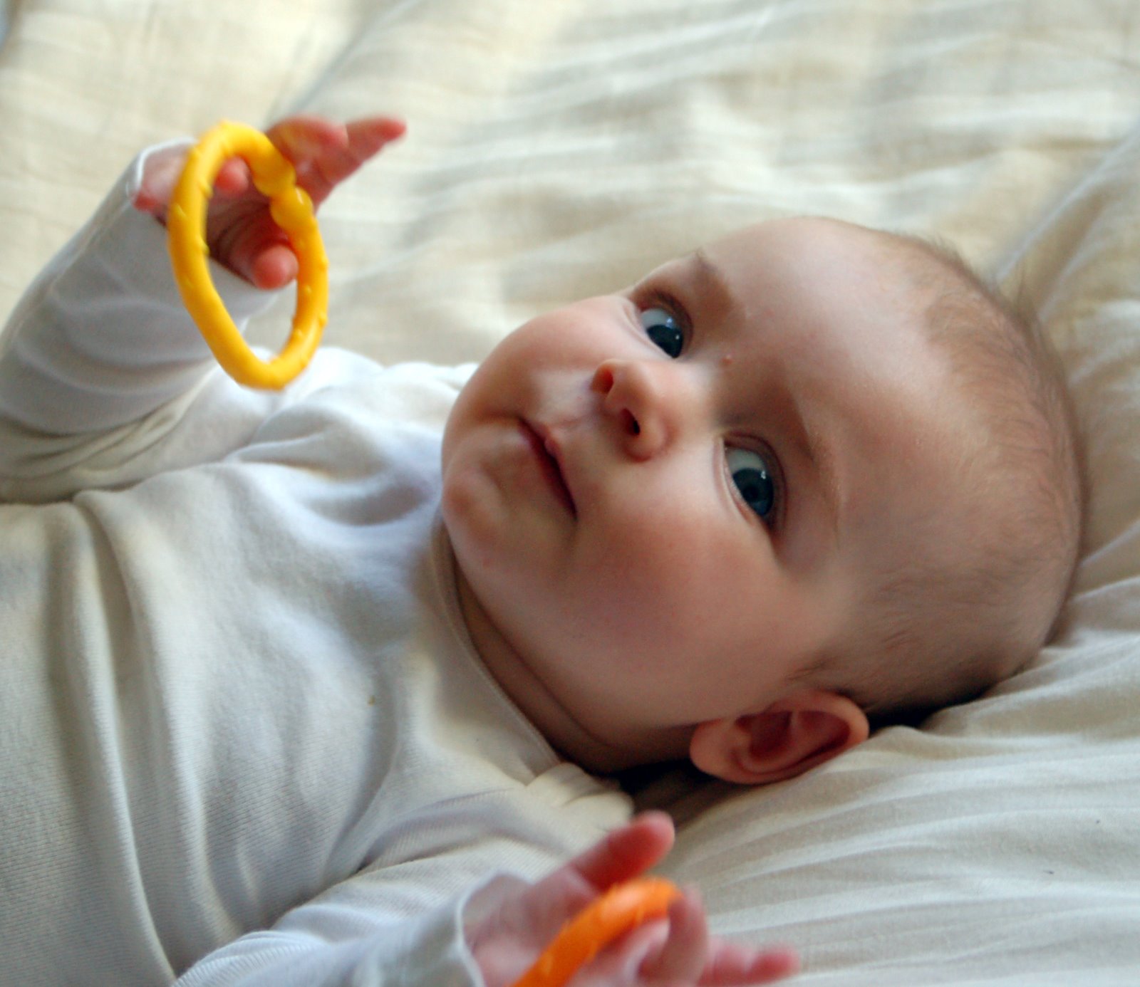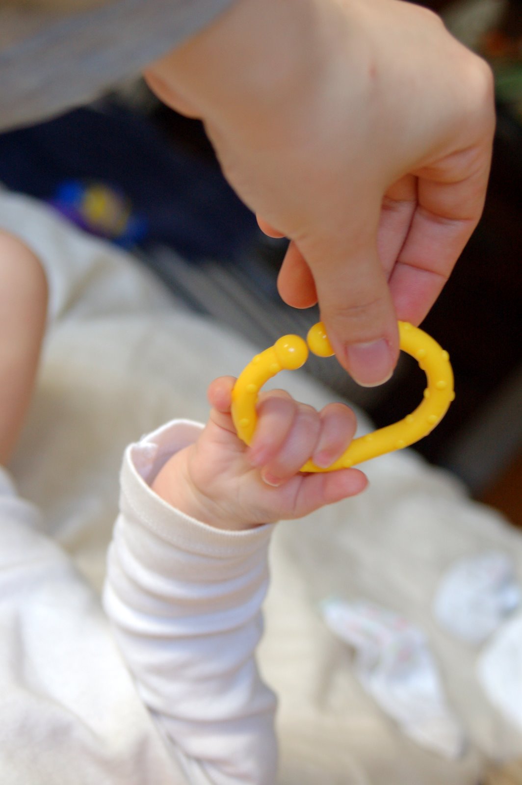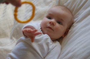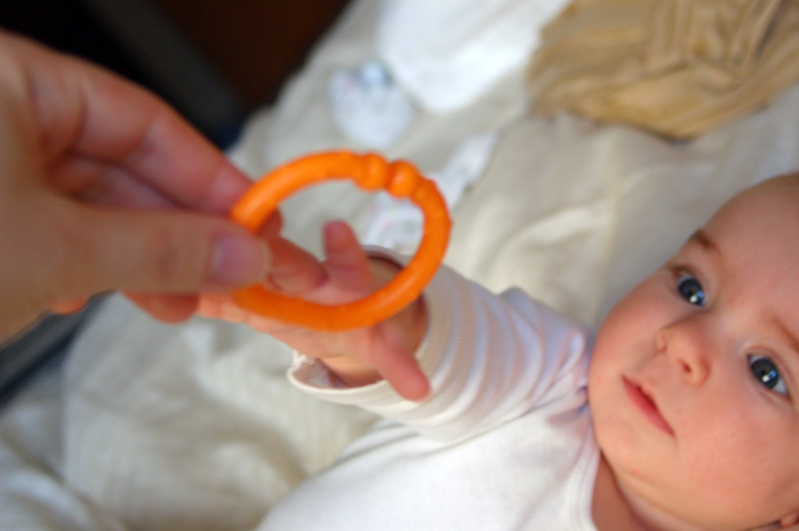 I posted not too long ago about Claire “gathering.” Over the past week though, she’s been reaching out with one hand – a big milestone according to our pediatrician. It’s fun to watch her as she grabs the links (a new favorite toy) and chomps away.