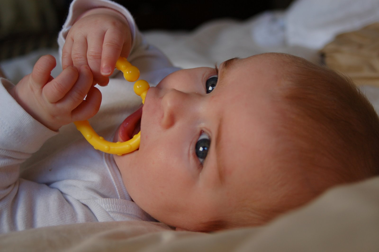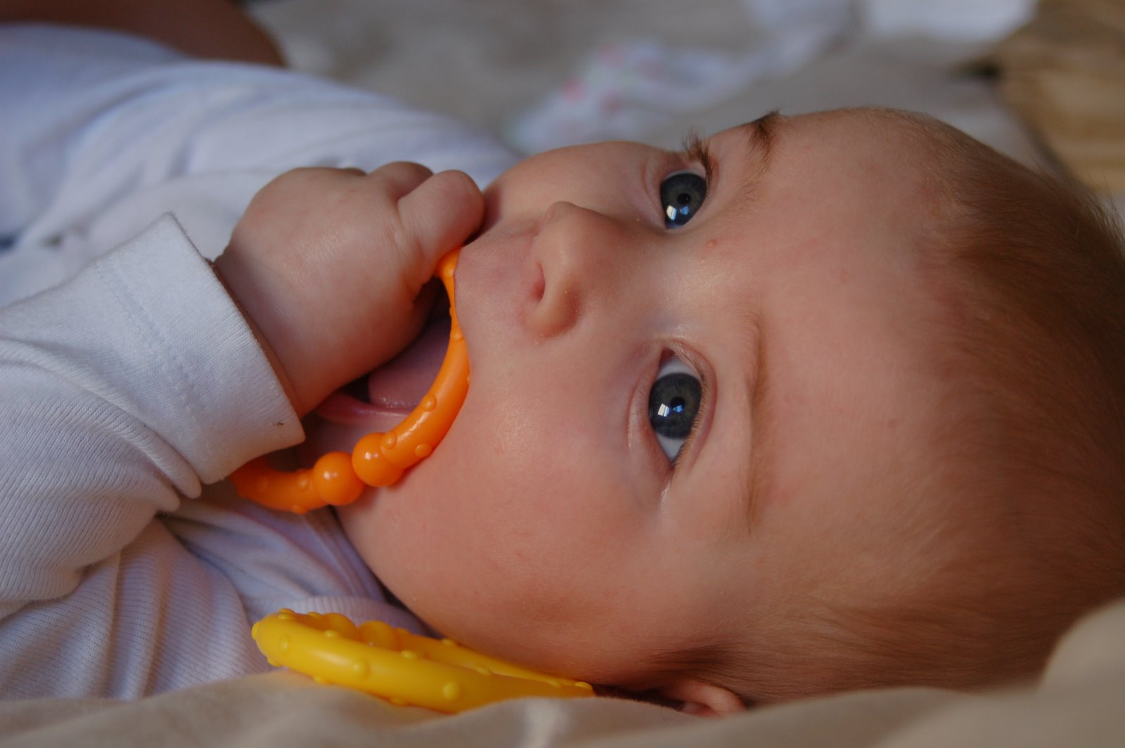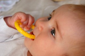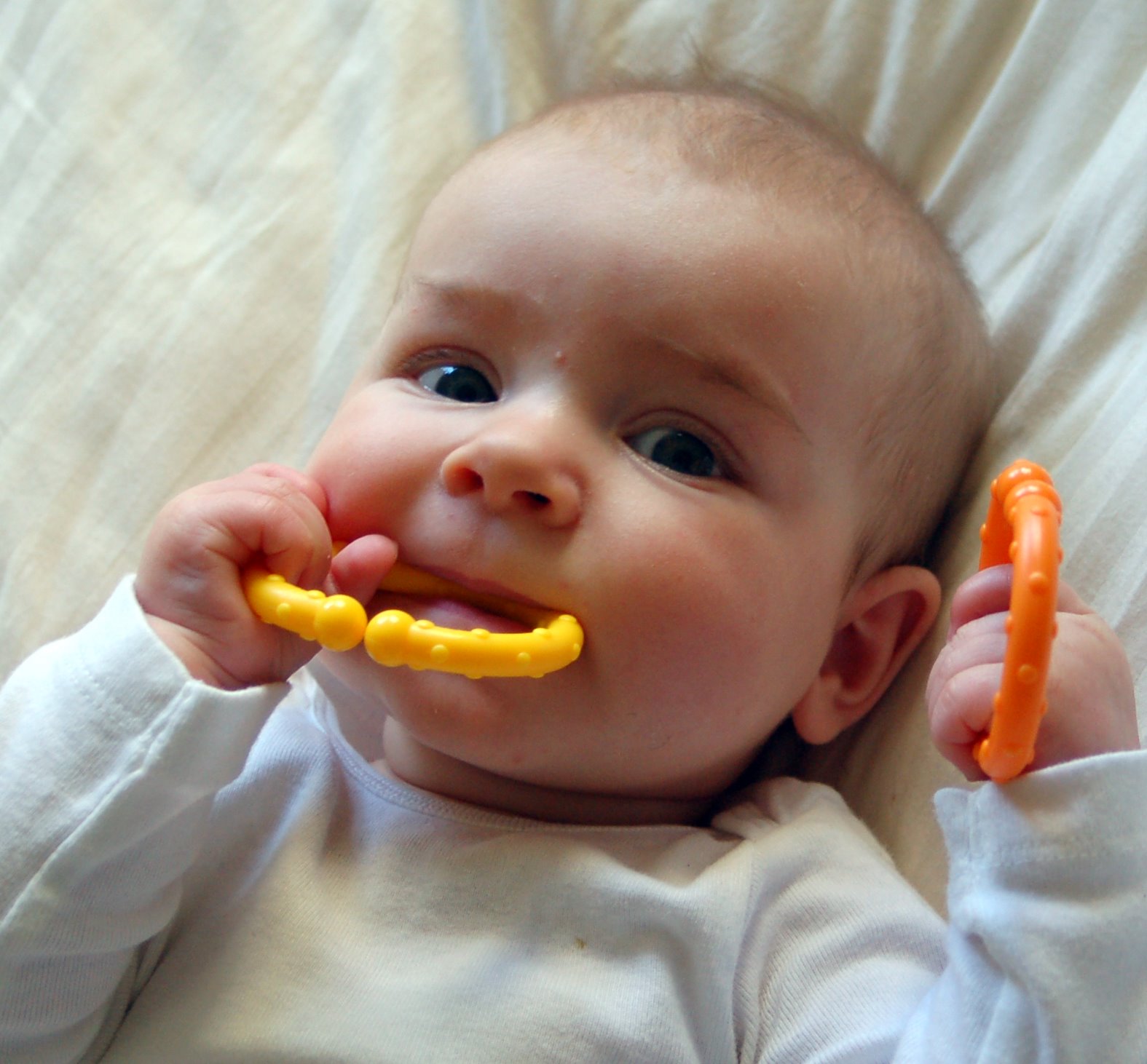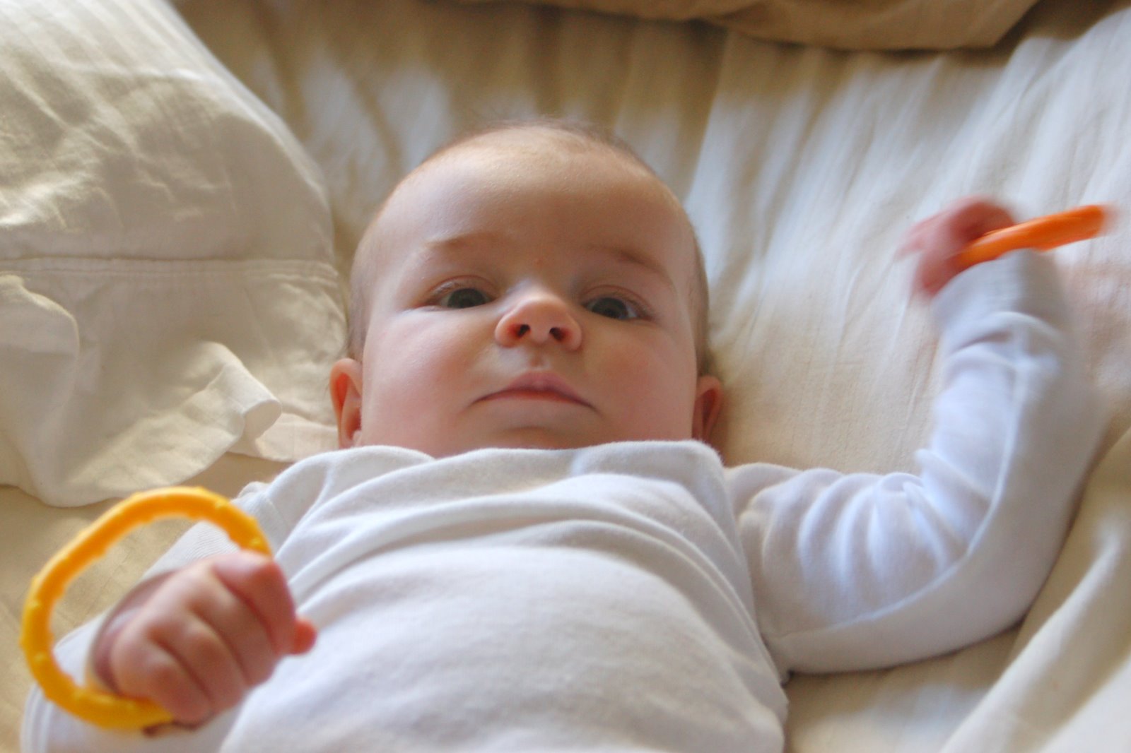 I posted not too long ago about Claire “gathering.” Over the past week though, she’s been reaching out with one hand – a big milestone according to our pediatrician. It’s fun to watch her as she grabs the links (a new favorite toy) and chomps away.