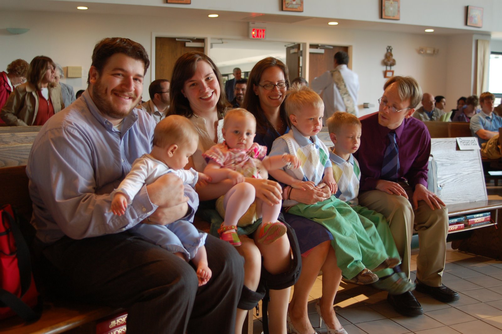 It was really a wonderful day and a great weekend. We had quite the full house with Kelly and Peter (our wonderful Godparents) and their three kiddos spending the night. That’s right, one lap for every kid in the house. Here’s a photo of our group: