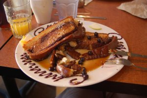 The next morning Claire got to sit in a restaurant high chair for the first time (she made eyes at all the other diners and surfer boys). Dan and I had the best french toast EVER. I had to photograph it…yum yum yum.