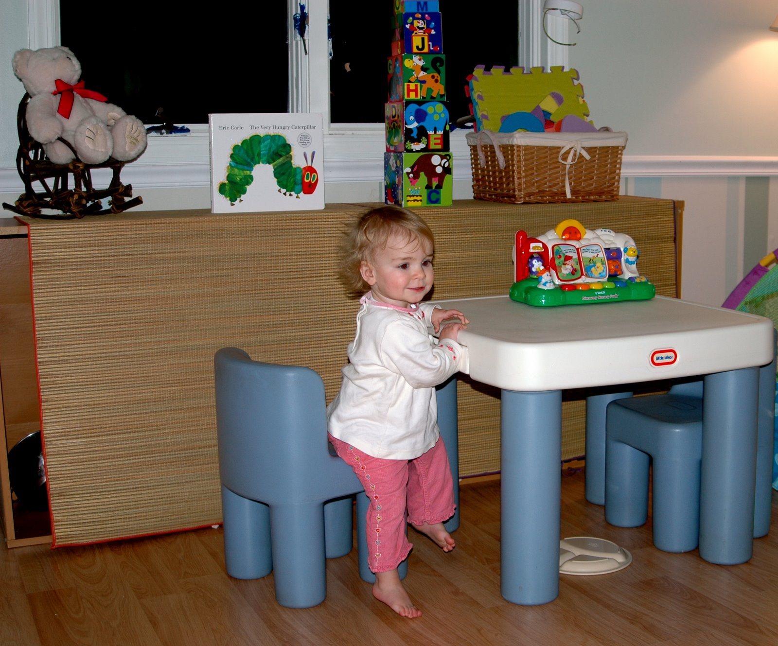 Our playroom is complete! We turned a bookshelf sideways and filled it with some of her favorite toys (baskets, metal mixing bowls, books) to keep things organized. Her stuffed animals live in the monkey tent and the old stroller toys found a new home in her “treehouse.” Aside from climbing and sliding, Claire really enjoys sitting at her big girl table and taking the dishes out of the its drawers.