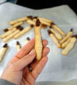 I’ll post a recipe for these creepy witches fingers tomorrow – check out the ridged nails and realistic knuckles! Spoooooooooky, Creeeeeepy, very Halloweeeeny! We brought these to a Halloween party (with jellybean nails) and also to GrandBob and Gran-C who found them deliciously scary. I *love* Halloween 🙂