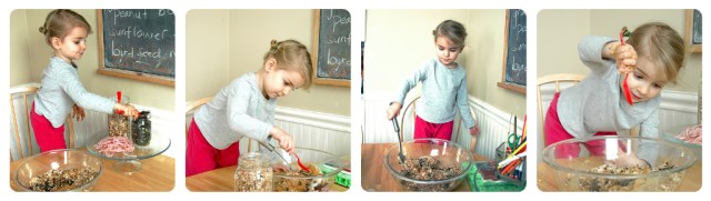 This is a kid friendly recipe, nothing to heat. I highly recommend limiting the distance from jar to bowl, or pouring the seed in. I was trying to make this project take up time on a cold morning and while Claire is very careful, there was still scattered seed from her scooping the seed little by little. Nothing intentional, but those little seeds kept rolling right off the spoon…maybe a scoop would work better?