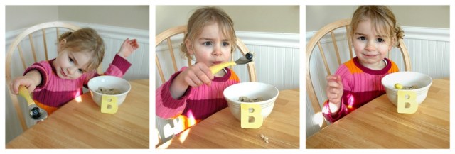 The letter game continued in the kitchen where Claire labeled her bowl with a sticky B and was sorely disappointed I would not allow her to stick another “B” onto her blueberries…or my butt. Sorry kid, I’ve got to draw the line somewhere and it better be before you figure out what XL might describe.