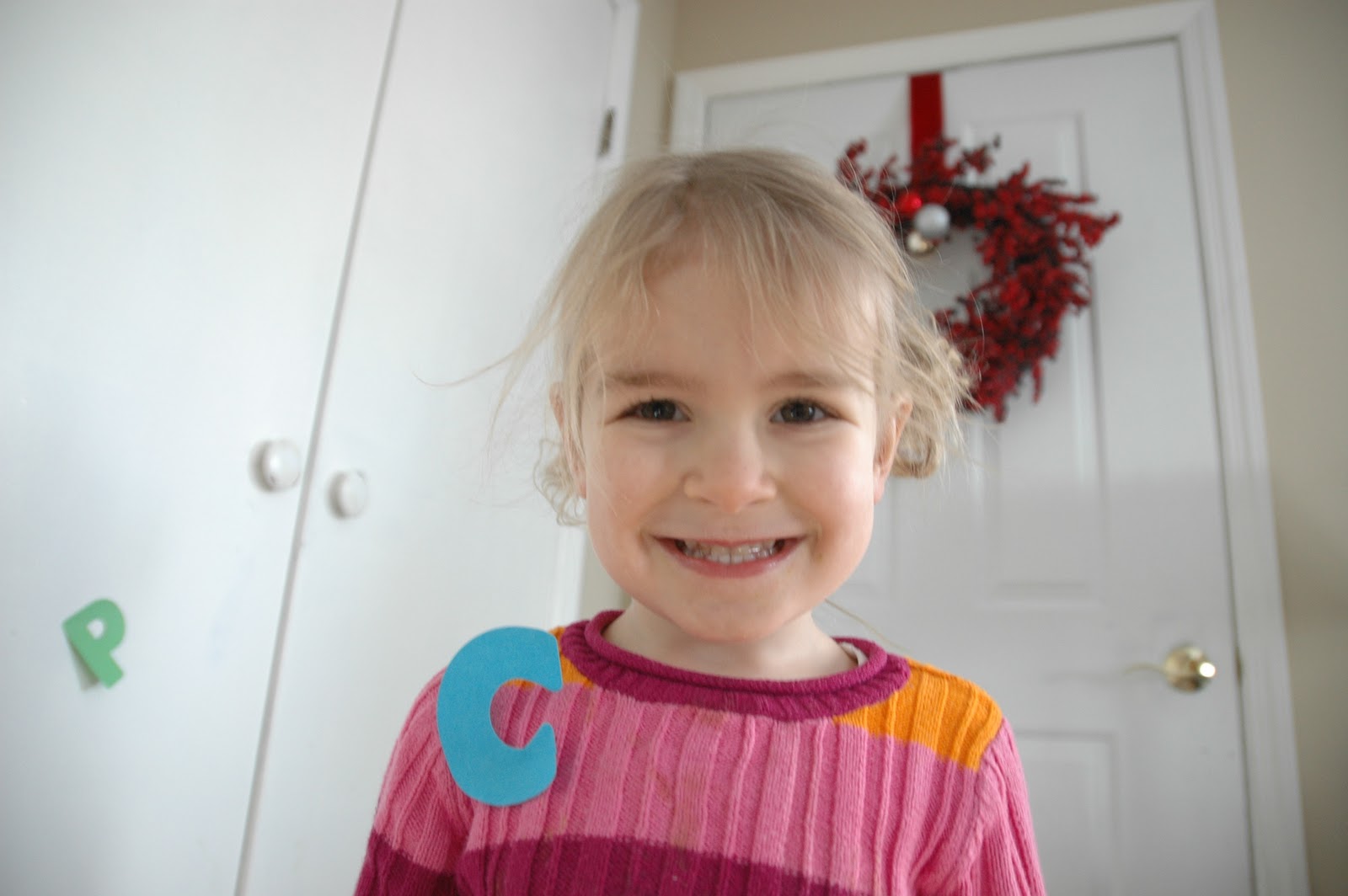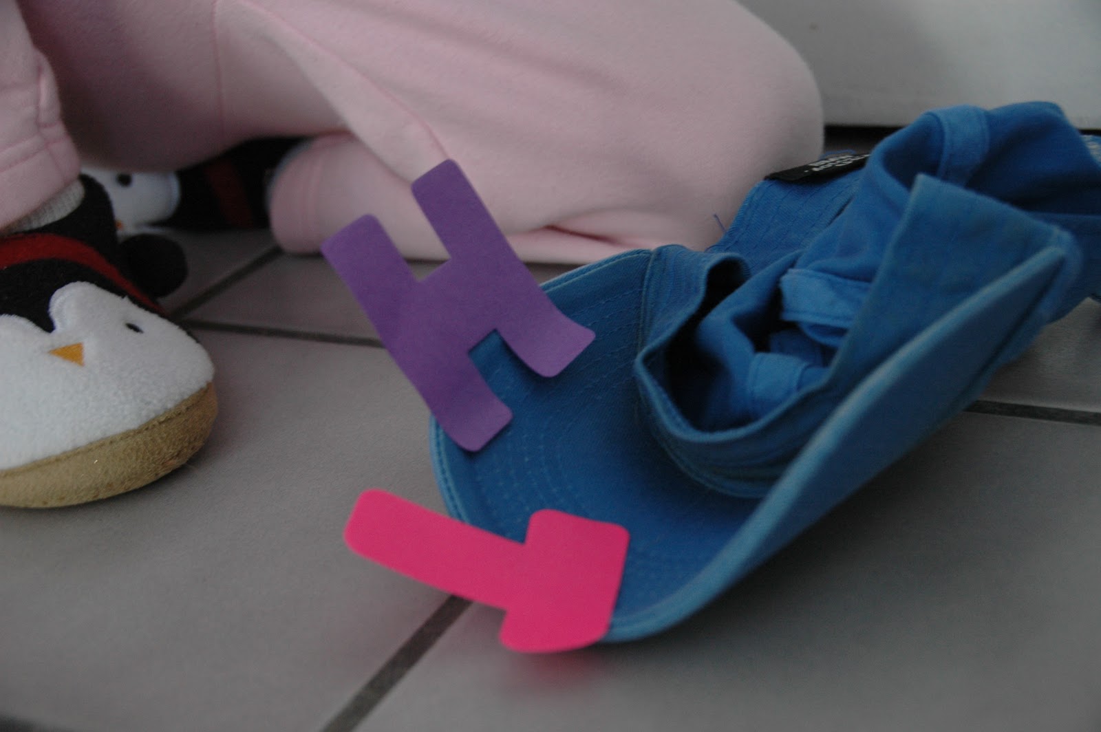 She put the H on my hat and at this point I abandoned her and a closet door full of letters to attend to my now smoking pan of oatmeal. When I came back into the living room, I found the T on the hat as well.