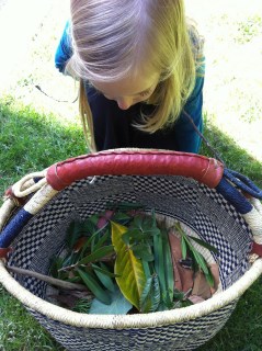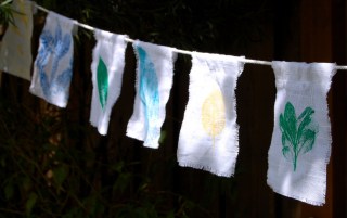 My daughter and I most enjoy art activities involving natural materials – especially ones that require a nature walk and collecting. We spent an afternoon in the neighborhood gathering leaves of all different shapes with the intention of using them to make prints on our garden flags.