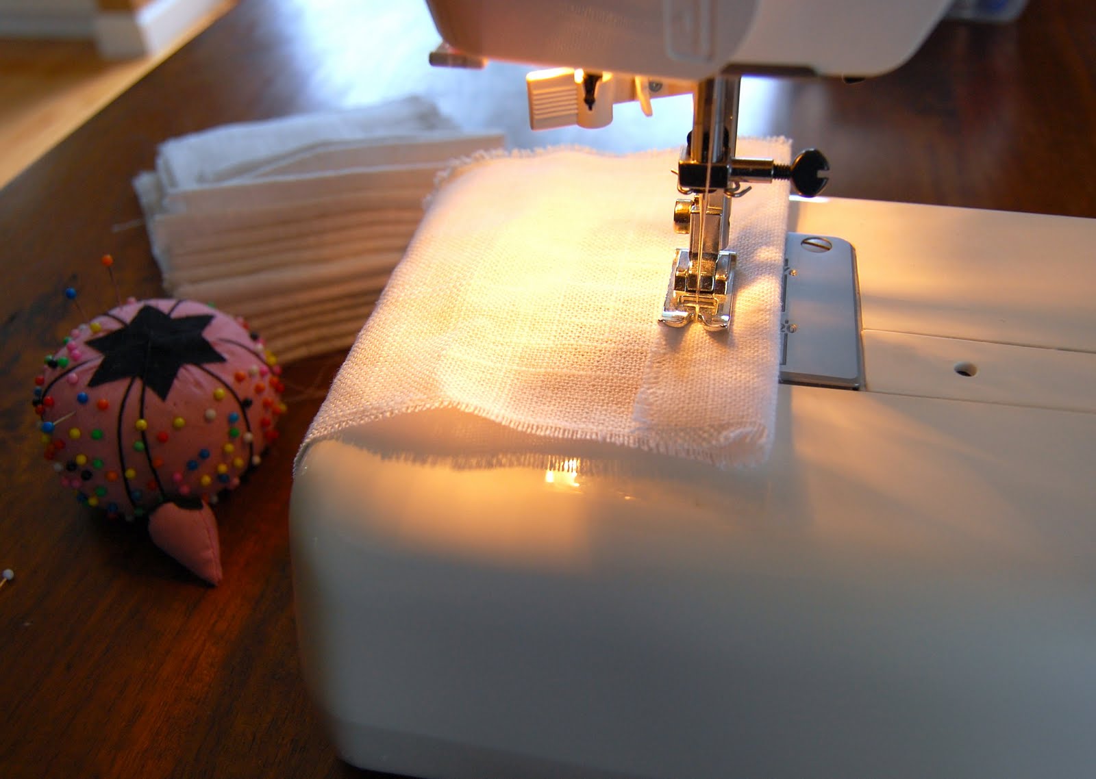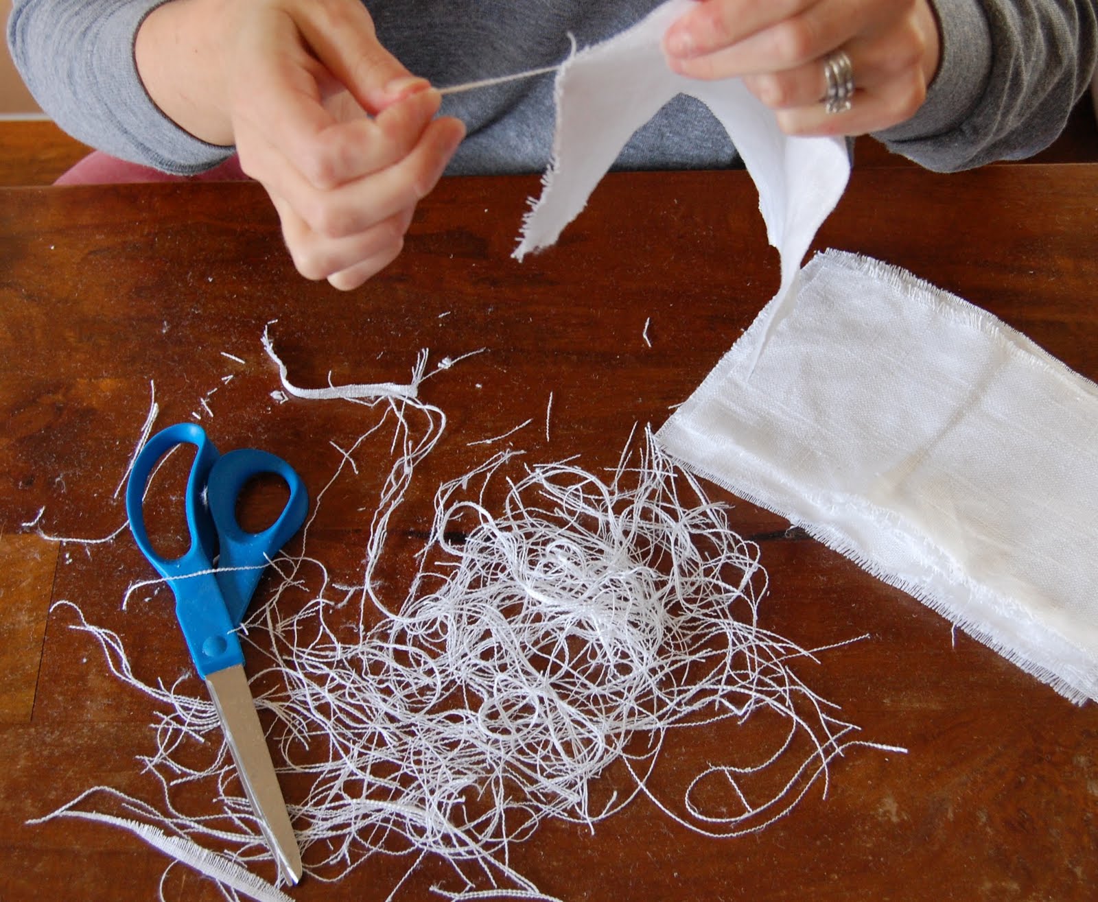 First, I cut a piece of white linen fabric I had into 4” x 5” rectangles. My daughter helped me to fray the edges for that rustic sort of look.