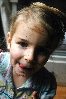 I took this shortly after our move to the new house when I let Claire loose with a bunch of paint and paper to keep her occupied while I neatly (ha!) unpacked our belongings. Unbeknownst to me she discovered spatter painting and seemed to have missed the paper but did a remarkable job on her face.