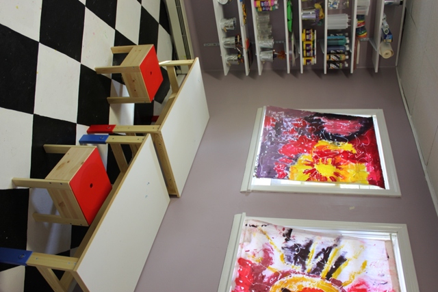 I’m so excited to have a room set aside for messy projects just off the kitchen. It’s 11 feet by 6 feet and sized just right for a long counter and a storage shelf. There’s a large south facing window that lets in great light. I’ve been scouring blogs for some inspiration on setting up an art space where Claire could work independently and leave enough room for when the two of us worked on a project together.