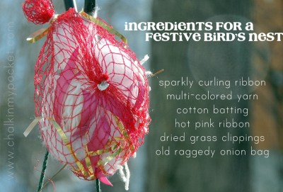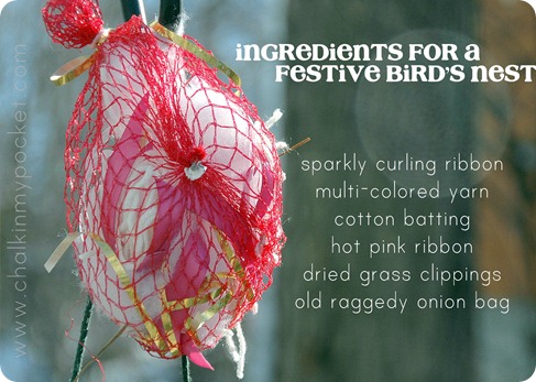 Wonderful idea! I was just thinking that we should put out some nest building materials for the birds. I've never thought of adding the colorful or sparkly bits, but it really is a fun idea!
