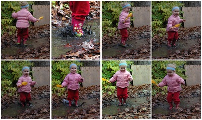 | Around 2 years old in the driveway’s muddy puddle. |