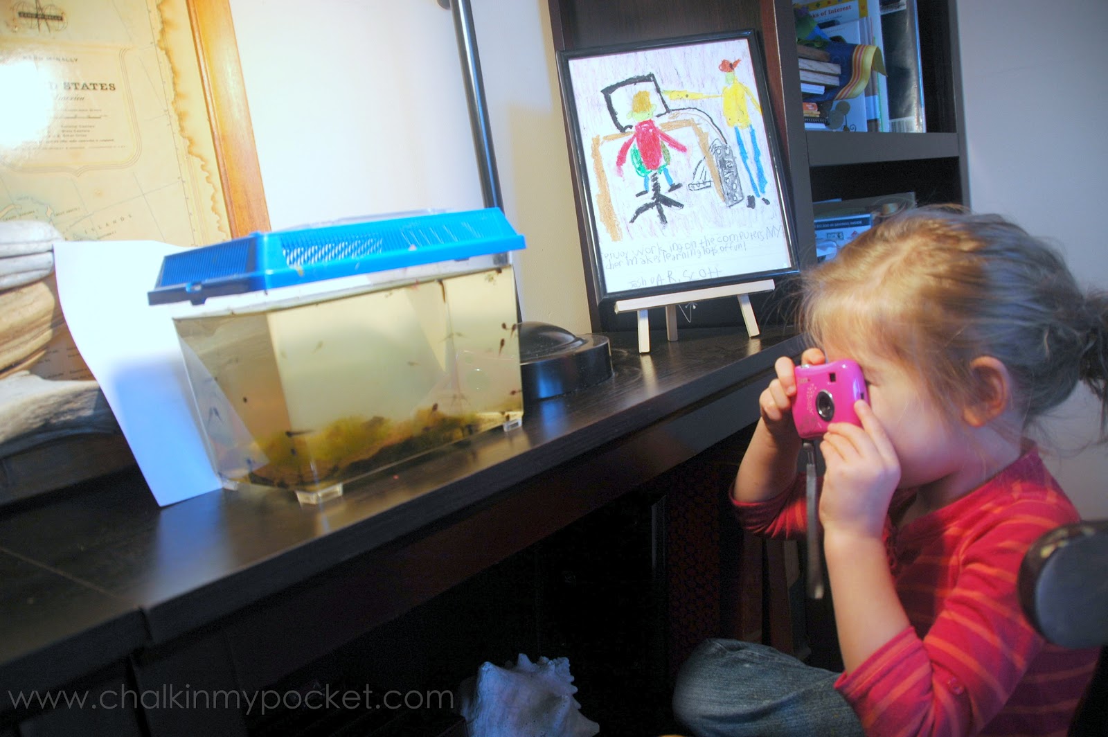 I swiped a few eggs for observation and we watched tiny tadpoles hatch and devour algae and leaf litter in a tank set up in the office. We’d keep them for a few days then dump them back in the pond to experience bigger digs. Rinse and repeat. We’re on the fourth or fifth tadpole infusion here.