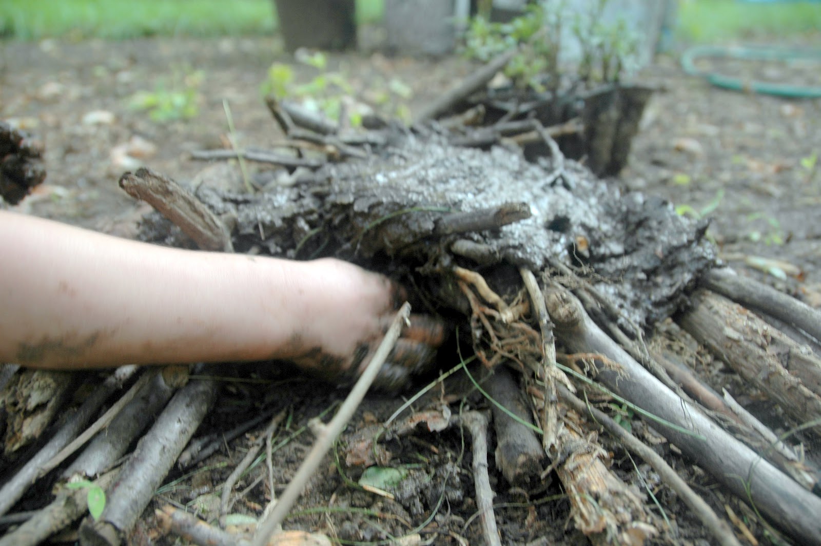 I think her construction technique was spot on. Lots of “logs,” mud to glue them all together and a thatched roof made of leaves. The toads in the yard are quickly learning to avoid the grass when Claire is afoot, this little one was forced to “enjoy” the barn she built. He hopped away a while later, but I’m not sure he actually disliked the place.