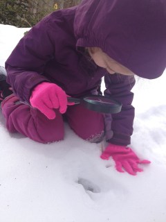 One of the most exciting parts of snow, is the revealing of the animal super-highways that criss-cross our little slice of wilderness. Armed with a magnifying glass (don’t ask, to Claire it was a neccesity) we walked our trails and found prints belonging to deer, fox, and coyote. I suspect one large set of tracks belonged to a resident blackbear but the deer tracks obscured them a bit.