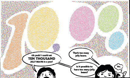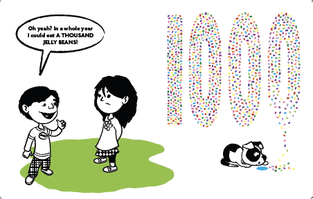 Each page has simple line drawing of the main characters, but it is the brightly drawn jellybeans that take center stage as siblings Emma and Aiden decide just how many jellybeans is too many. 10? 20? 10,000? On and on to ONE MILLION.Hoarder tendencies aside, my daughter claimed about 1,000 would be great, roughly three a day.