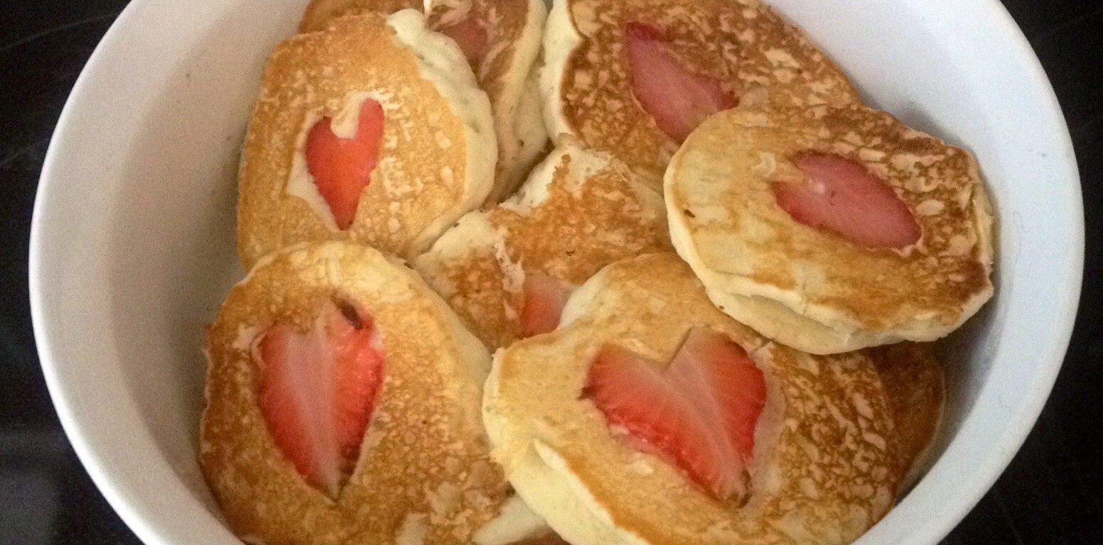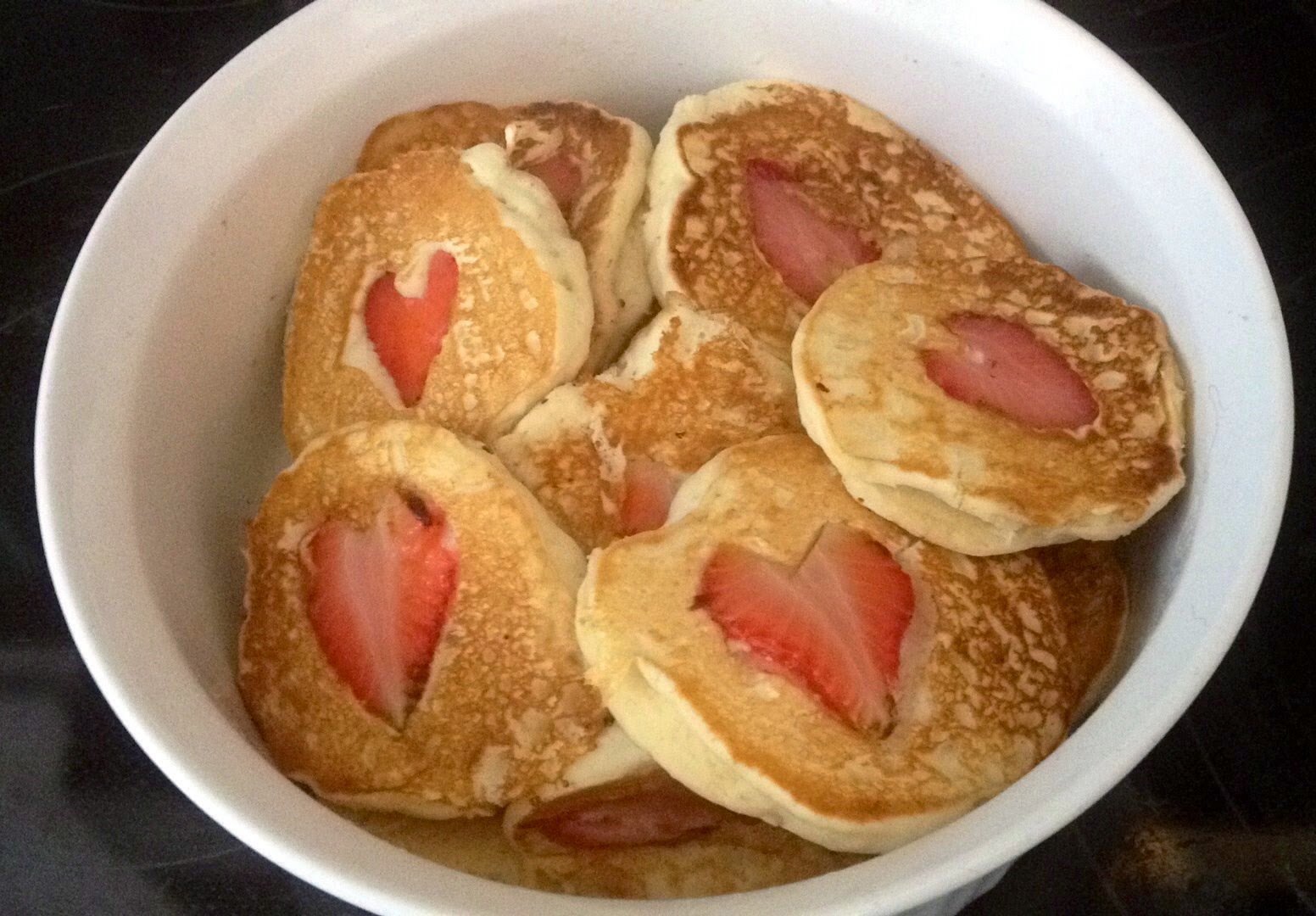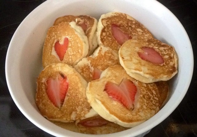 Pour your batter onto griddle and press a strawberry into the “raw” side before flipping, wait a few seconds and press again. The more the strawberry is embedded in the pancake, the more it will look like a heart.